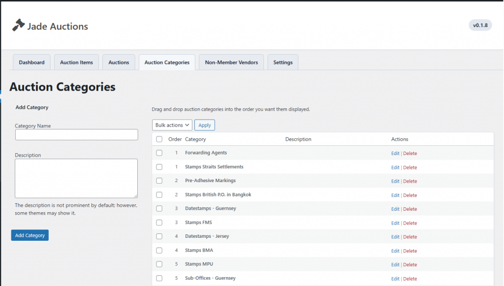 To Add a new catagory simply type the category name into the appropriate box ont he left and click Add Category. The description is optional. It will not appear on your auction list.