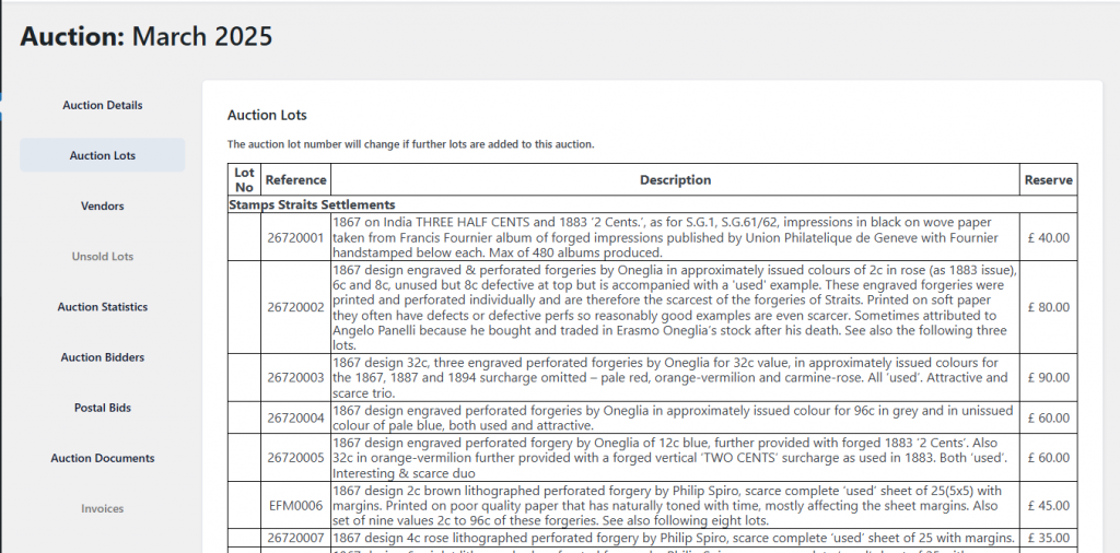 Vendors: The list of vendors with items in this auction, their unique vendor ID and how many items they have in this auction. Once you have finalised the auction you will also be able to downlod a PDF of each vendors lots to share with them.