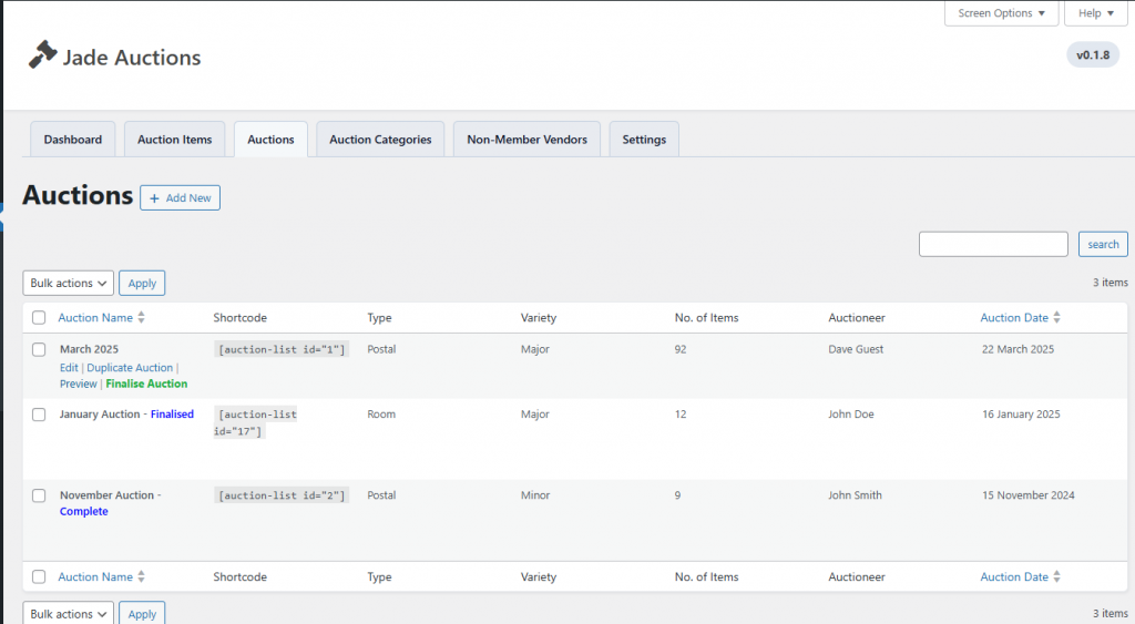 Click the green Finalise Auction button. This process is not reversible. Prossing this button will finalise your auction, give each item a lot number, generate the Auction List PDF and Auction List CSV and allow the auction list to be viewed on your website.